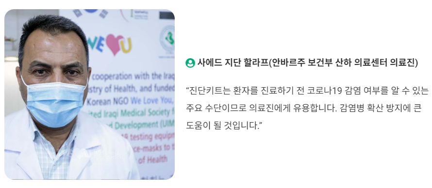 이라크연합의료협회는 2018년 위러브유와 양해각서(MOU)를 체결한 비정부기구로, 세계보건기구(WHO) 및 이라크 보건부와 소통하며 이라크 전역에서 코로나19 방역활동을 펼치고 있습니다.